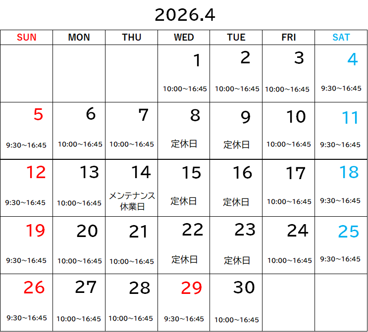 ※台風などの悪天候等により、臨時休業させていただく事があります。ご了承ください。